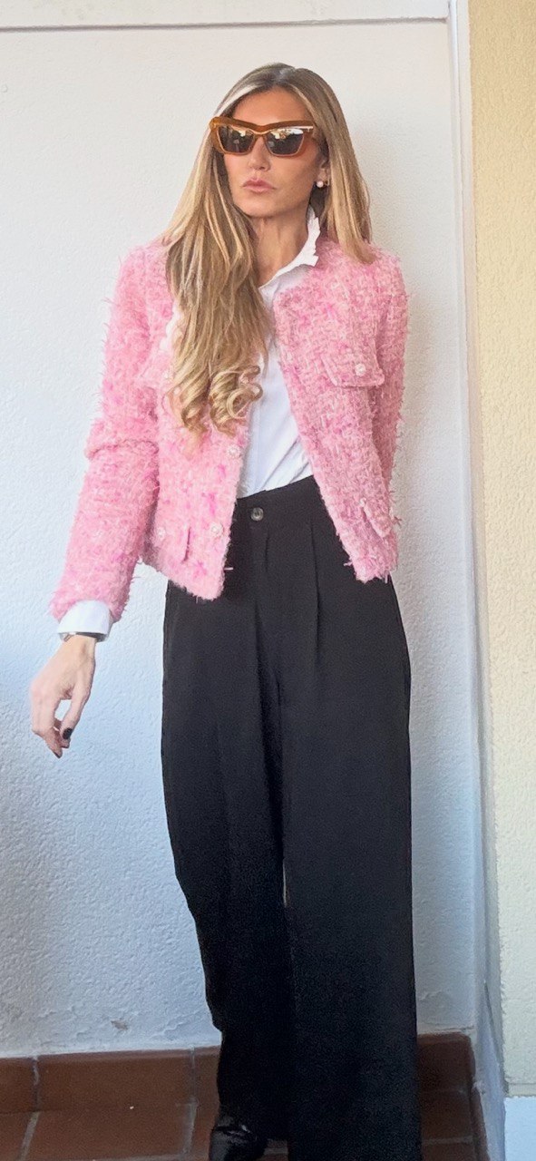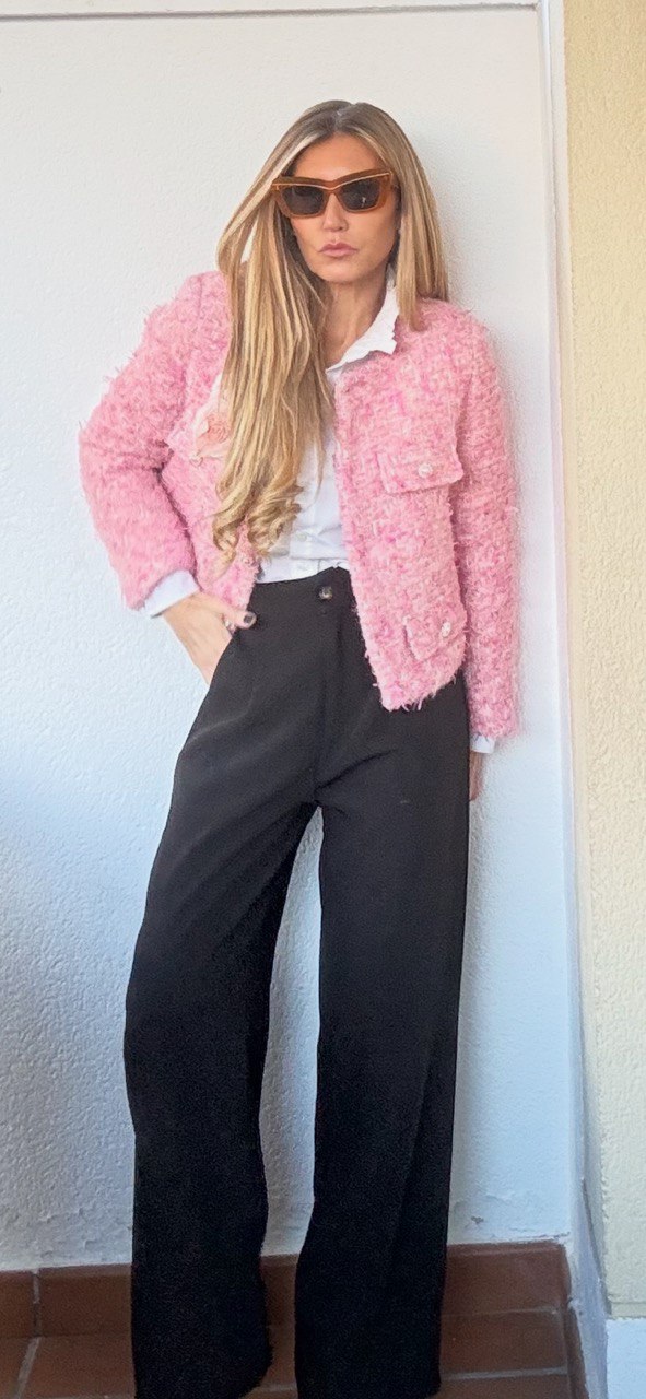 Chaqueta Rosas, con broches, botones joya y tejido tipo tweed, en color rosa, y forrada – guatada en su interior